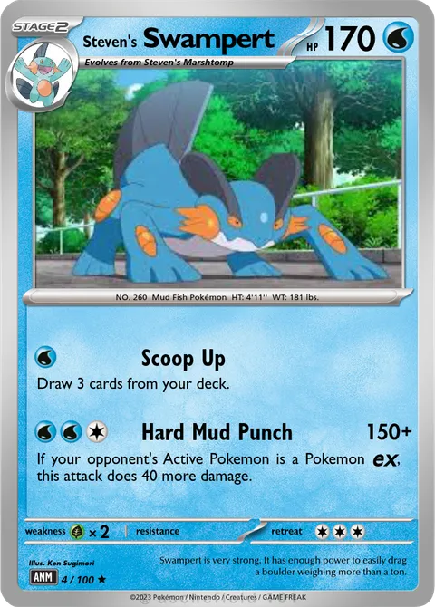 NO. 260 Mud Fish Pokémon HT: 4'11'' WT: 181 lbs.illus. Ken Sugimori#4/100Swampert is very strong. It has enough power to easily drag a boulder weighing more than a ton.Created by @3nderbro75 on 05 June 2025