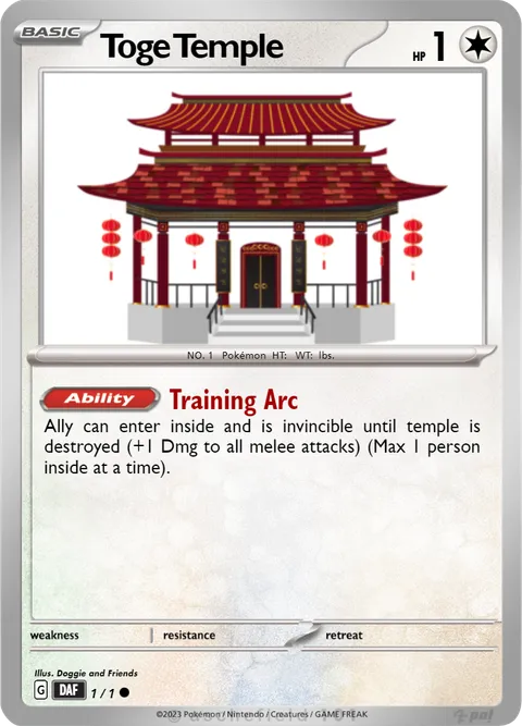Ally can enter inside and is invincible until temple is destroyed (+1 Dmg to all melee attacks) (Max 1 person inside at a time).Weakness:None