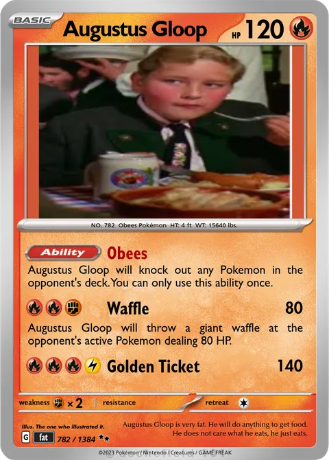 Augustus Gloop will knock out any Pokemon in the opponent's deck. You can only use this ability once.Waffle • 80