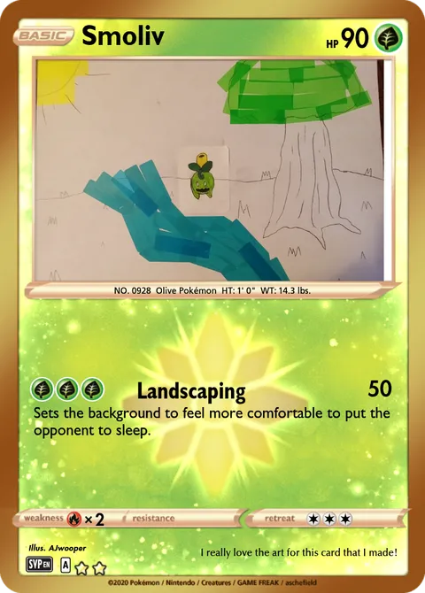NO. 0928 Olive Pokémon HT: 1' 0" WT: 14.3 lbs.illus. AJwooperI really love the art for this card that I made!Created by @AJwooperOG on 22 February 2026Includes assets by Creatures Inc.