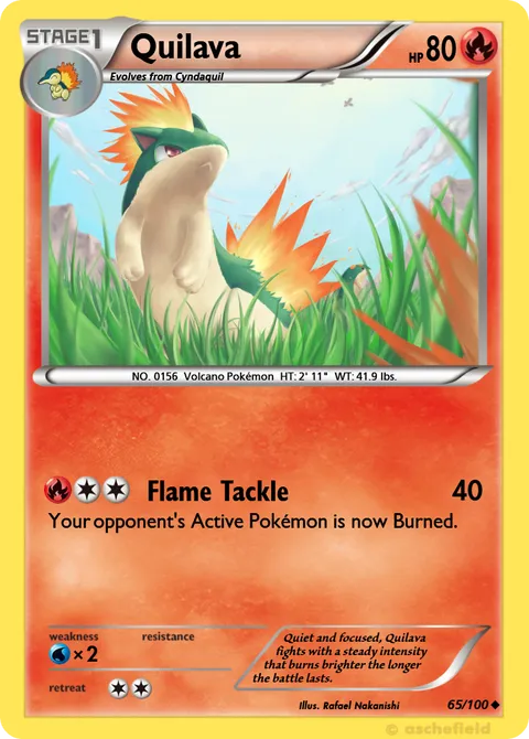 NO. 0156 Volcano Pokémon HT: 2' 11" WT: 41.9 lbs.illus. Rafael Nakanishi#65/100Quiet and focused, Quilava fights with a steady intensity that burns brighter the longer the battle lasts.Created by @AWD06 on 09 March 2026, last edited on 09 March 2026Includes assets by Creatures Inc.