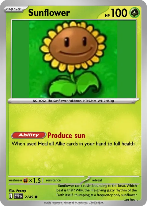 NO. 0002 The Sunflower Pokémon HT: 0.9 m WT: 0.95 kgillus. Popcap#2/49Sunflower can’t resist bouncing to the beat. Which beat is that? Why, the life-giving jazzy rhythm of the Earth itself, thumping at a frequency only sunflower can hear.Created by @Abrahamglez on 07 March 2026, last edited on 07 March 2026