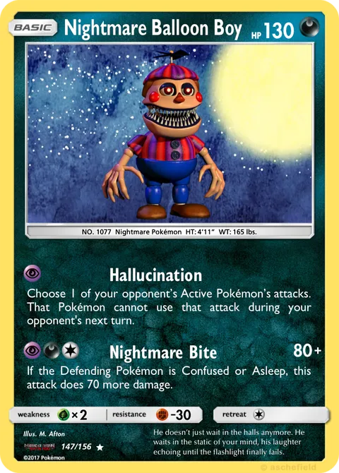 NO. 1077 Nightmare Pokémon HT: 4’11” WT: 165 lbs.illus. M. Afton#147/156He doesn’t just wait in the halls anymore. He waits in the static of your mind, his laughter echoing until the flashlight finally fails.Created by @AdrianC_2026 on 11 March 2026Includes assets by Creatures Inc.