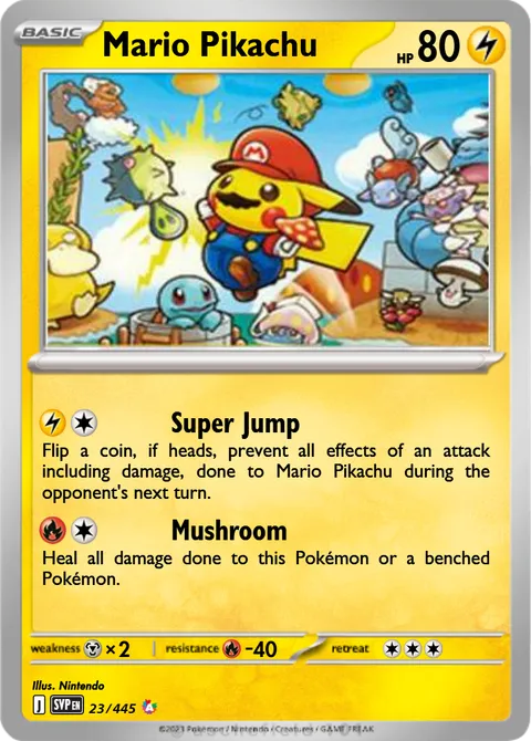 Flip a coin, if heads, prevent all effects of an attack including damage, done to Mario Pikachu during the opponent's next turn.