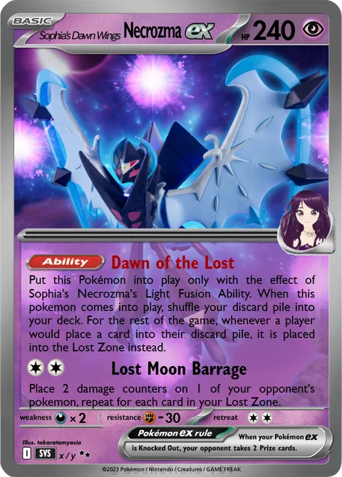 Put this Pokémon into play only with the effect of Sophia's Necrozma's Light Fusion Ability. When this pokemon comes into play, shuffle your discard pile into your deck. For the rest of the game, whenever a player would place a card into their discard pile, it is placed into the Lost Zone instead.Lost Moon Barrage