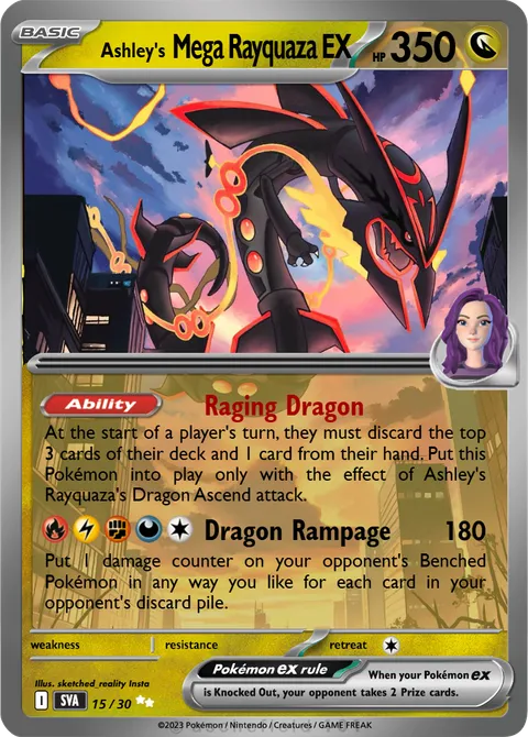 At the start of a player's turn, they must discard the top 3 cards of their deck and 1 card from their hand. Put this Pokémon into play only with the effect of Ashley's Rayquaza's Dragon Ascend attack.