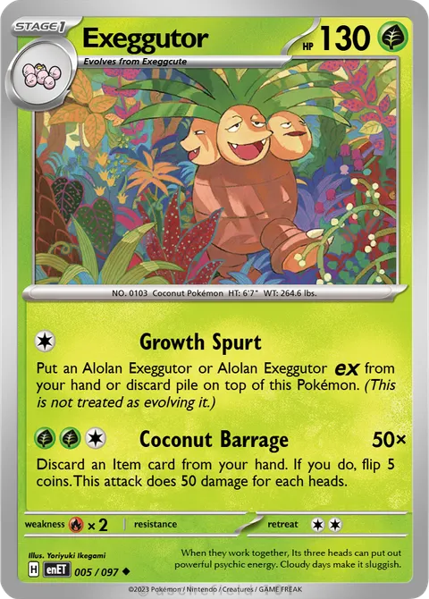 NO. 0103 Coconut Pokémon HT: 6'7" WT: 264.6 lbs.illus. Yoriyuki Ikegami#005/097When they work together, Its three heads can put out powerful psychic energy. Cloudy days make it sluggish.Created by @Avalan on 08 March 2025