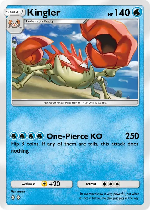 NO. 0099 Pincer Pokémon HT: 4'3" WT: 132.3 lbs.illus. matchIts oversized claw is very powerful, but when it’s not in battle, the claw just gets in the way.Created by @Avalan on 03 February 2026