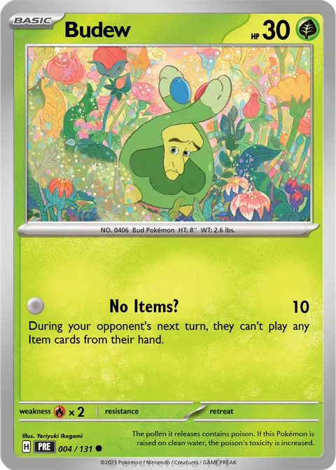 NO. 0406 Bud Pokémon HT: 8'' WT: 2.6 lbs.illus. Yoriyuki Ikegami#004/131The pollen it releases contains poison. If this Pokémon is raised on clean water, the poison's toxicity is increased.Created by @Avocadofish on 01 July 2025