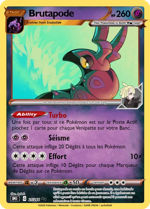 Une fois par tour, si ce Pokémon est sur le Poste Actif, piochez 1 carte pour chaque Venipatte sur votre Banc.Séisme