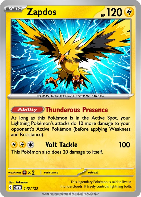 NO. 0145 Electric Pokémon HT: 5'03" WT: 116.0 lbs.illus. Pokemon#145/123This legendary Pokémon is said to live in thunderclouds. It freely controls lightning bolts.Created by @BEEMO on 28 March 2026