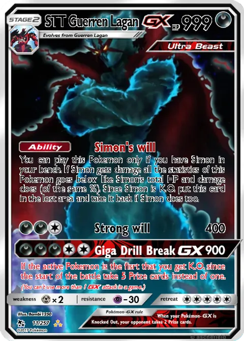 You can play this Pokemon only if you have Simon in your bench. If Simon gets damage all the statistics of this Pokemon goes below like Simon's total HP and damage does (of the same %). Since Simon is K.O. put this card in the lost area and take it back if Simon does too.Strong will • 400