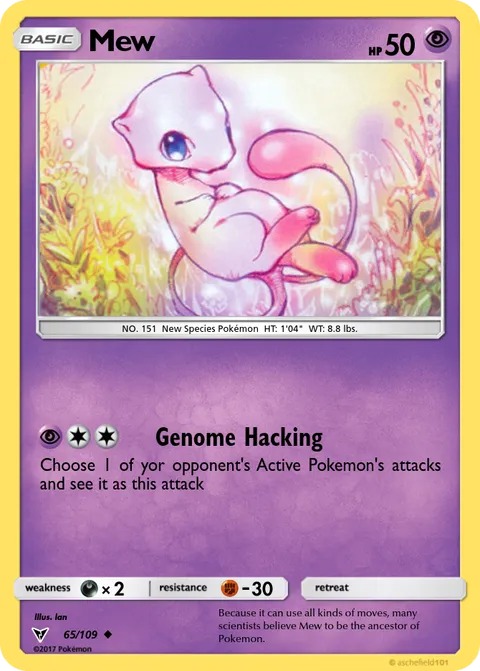 NO. 151 New Species Pokémon HT: 1'04" WT: 8.8 lbs.illus. Ian#65/109Because it can use all kinds of moves, many scientists believe Mew to be the ancestor of Pokemon.Created by @Best_Pokemon_Cards on 09 May 2024