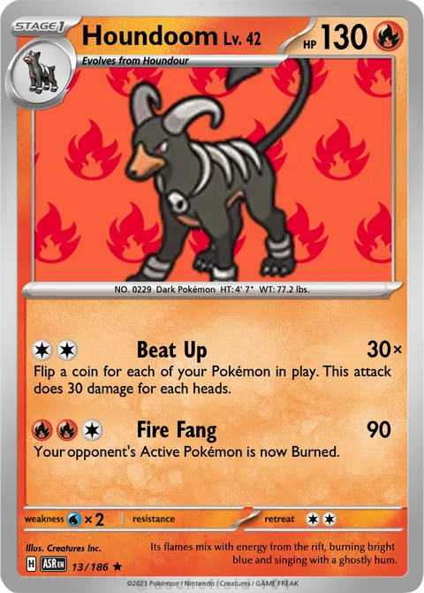 NO. 0229 Dark Pokémon HT: 4' 7" WT: 77.2 lbs.illus. Creatures Inc.#13/186Its flames mix with energy from the rift, burning bright blue and singing with a ghostly hum.Created by @BfamBrayden on 20 February 2026Includes assets by Creatures Inc.
