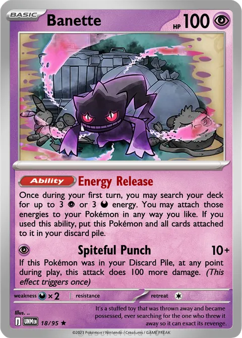 Once during your first turn, you may search your deck for up to 3 P or 3 D energy. You may attach those energies to your Pokémon in any way you like. If you used this ability, put this Pokémon and all cards attached to it in your discard pile.Spiteful Punch • 10+