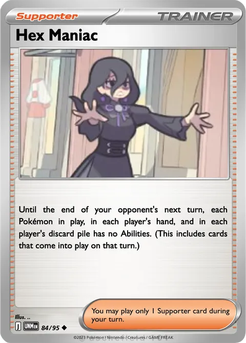 Until the end of your opponent's next turn, each Pokémon in play, in each player's hand, and in each player's discard pile has no Abilities. (This includes cards that come into play on that turn.)