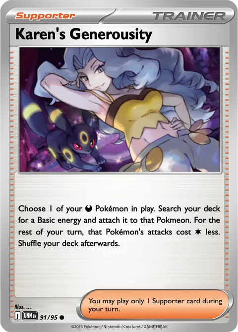 Choose 1 of your D Pokémon in play. Search your deck for a Basic energy and attach it to that Pokmeon. For the rest of your turn, that Pokémon's attacks cost C less. Shuffle your deck afterwards.