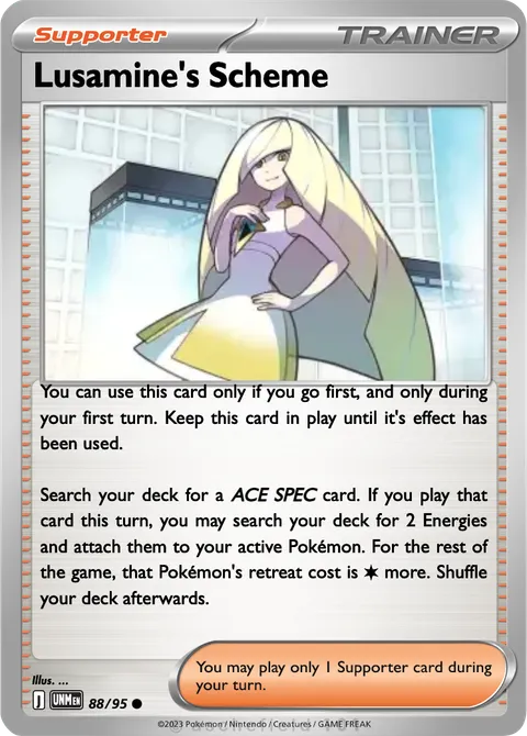You can use this card only if you go first, and only during your first turn. Keep this card in play until it's effect has been used. Search your deck for a ACE SPEC card. If you play that card this turn, you may search your deck for 2 Energies and attach them to your active Pokémon. For the rest of the game, that Pokémon's retreat cost is C more. Shuffle your deck afterwards.