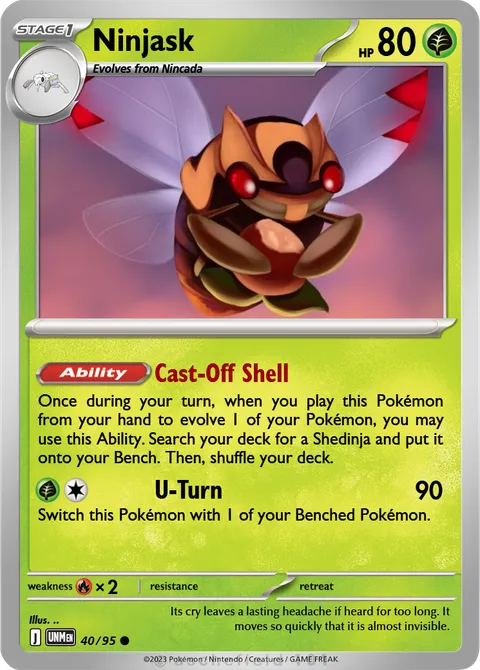Once during your turn, when you play this Pokémon from your hand to evolve 1 of your Pokémon, you may use this Ability. Search your deck for a Shedinja and put it onto your Bench. Then, shuffle your deck.U-Turn • 90