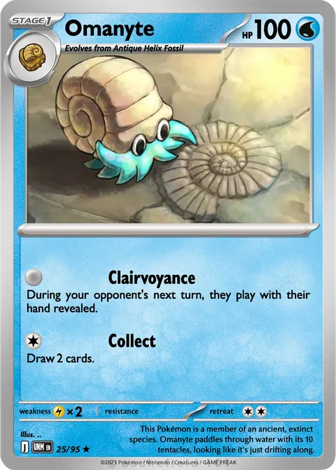 illus. ..#25/95This Pokémon is a member of an ancient, extinct species. Omanyte paddles through water with its 10 tentacles, looking like it's just drifting along.Created by @Bigguybruno on 08 December 2025