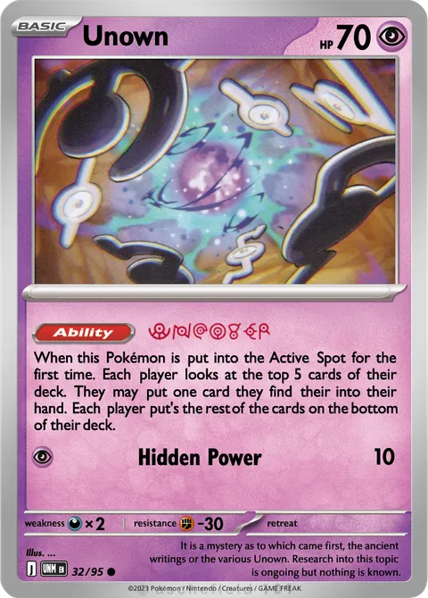 When this Pokémon is put into the Active Spot for the first time. Each player looks at the top 5 cards of their deck. They may put one card they find their into their hand. Each player put's the rest of the cards on the bottom of their deck.Hidden Power • 10