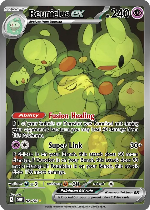 If Solosis is on your Bench, this attack does 60 more damage. If Duosion is on your Bench, this attack does 90 more damage. If Reuniclus is on your Bench, this attack does 120 more damage.