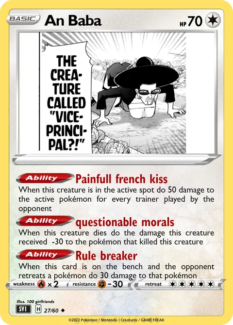 When this creature is in the active spot do 50 damage to the active pokémon for every trainer played by the opponentAbility: questionable morals