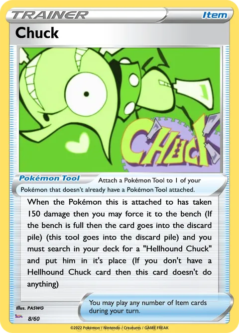 When the Pokémon this is attached to has taken 150 damage then you may force it to the bench (If the bench is full then the card goes into the discard pile) (this tool goes into the discard pile) and you must search in your deck for a "Hellhound Chuck" and put him in it's place (If you don't have a Hellhound Chuck card then this card doesn't do anything)