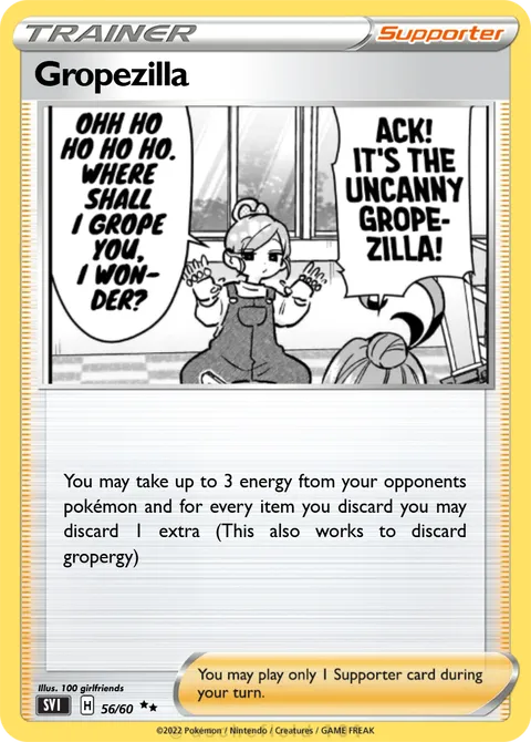 You may take up to 3 energy ftom your opponents pokémon and for every item you discard you may discard 1 extra (This also works to discard gropergy)