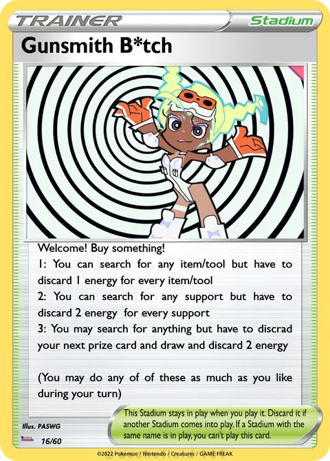 Welcome! Buy something! 1: You can search for any item/tool but have to discard 1 energy for every item/tool 2: You can search for any support but have to discard 2 energy for every support 3: You may search for anything but have to discrad your next prize card and draw and discard 2 energy (You may do any of of these as much as you like during your turn)