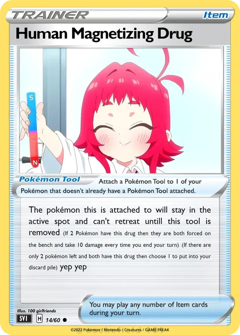 The pokémon this is attached to will stay in the active spot and can't retreat untill this tool is removed (If 2 Pokémon have this drug then they are both forced on the bench and take 10 damage every time you end your turn) (If there are only 2 pokémon left and both have this drug then choose 1 to put into your discard pile) yep yep