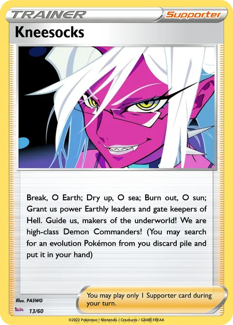 Break, O Earth; Dry up, O sea; Burn out, O sun; Grant us power Earthly leaders and gate keepers of Hell. Guide us, makers of the underworld! We are high-class Demon Commanders! (You may search for an evolution Pokémon from you discard pile and put it in your hand)