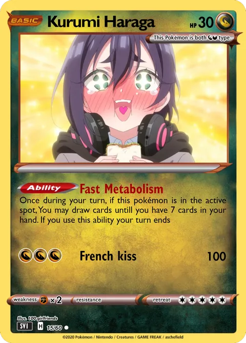 Once during your turn, if this pokémon is in the active spot, You may draw cards untill you have 7 cards in your hand. If you use this ability your turn endsFrench kiss • 100