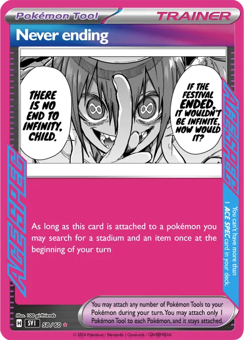 As long as this card is attached to a pokémon you may search for a stadium and an item once at the beginning of your turn
