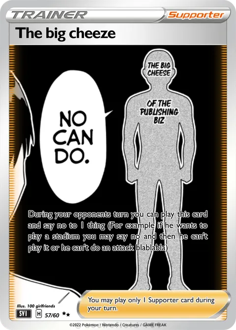 During your opponents turn you can play this card and say no to 1 thing (For example if he wants to play a stadium you may say no and then he can't play it or he can't do an attack blablabla)