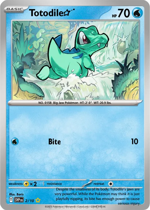 NO. 0158 Big Jaw Pokémon HT: 2' 0" WT: 20.9 lbs.illus. Boris #2/10Despite the smallness of its body, Totodile’s jaws are very powerful. While the Pokémon may think it is just playfully nipping, its bite has enough power to cause serious injury.Created by @Boris22103 on 11 March 2026Includes assets by Creatures Inc.