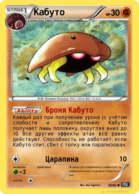 Каждый раз при получении урона (с учётом слабости и сопротивления) Кабуто получает лишь половину, округляя вниз до 10. Все другие эффекты атак всё равно действуют. Способность не работает, если Кабуто спит, сбит с толку или парализован.Царапина • 10