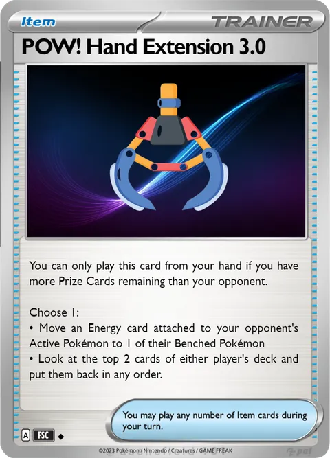 You can only play this card from your hand if you have more Prize Cards remaining than your opponent. Choose 1: • Move an Energy card attached to your opponent's Active Pokémon to 1 of their Benched Pokémon • Look at the top 2 cards of either player's deck and put them back in any order.