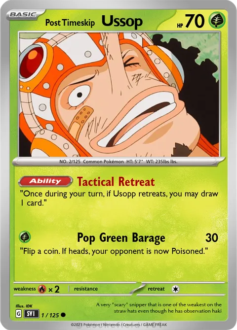 "Once during your turn, if Usopp retreats, you may draw 1 card."Pop Green Barage • 30
