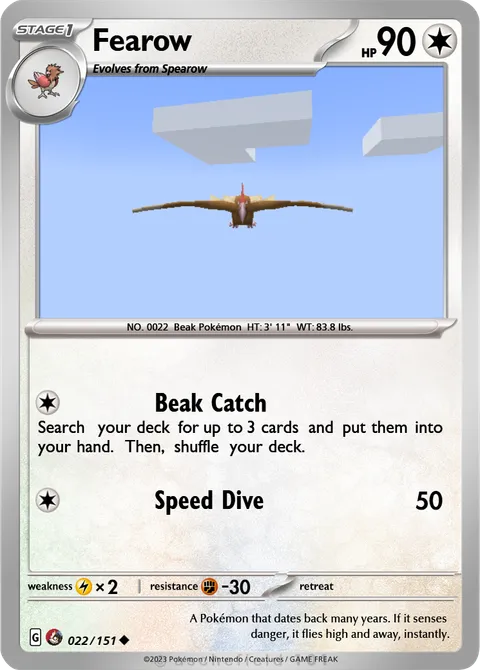 NO. 0022 Beak Pokémon HT: 3' 11" WT: 83.8 lbs.#022/151A Pokémon that dates back many years. If it senses danger, it flies high and away, instantly.Created by @BurritoBison on 22 March 2026, last edited on 22 March 2026Includes assets by Creatures Inc.