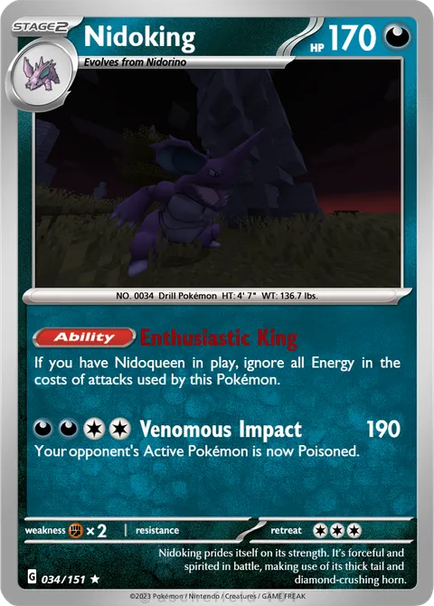 NO. 0034 Drill Pokémon HT: 4' 7" WT: 136.7 lbs.#034/151Nidoking prides itself on its strength. It’s forceful and spirited in battle, making use of its thick tail and diamond-crushing horn.Created by @BurritoBison on 24 March 2026Includes assets by Creatures Inc.