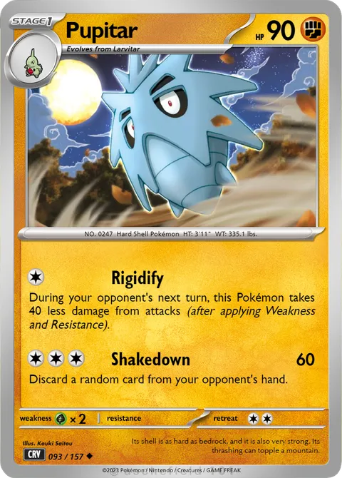NO. 0247 Hard Shell Pokémon HT: 3'11" WT: 335.1 lbs.illus. Kouki Saitou#093/157Its shell is as hard as bedrock, and it is also very strong. Its thrashing can topple a mountain.Created by @C_Ezra_M on 22 July 2024