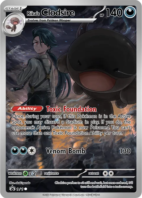 Once during your turn, if this Pokémon is in the Active Spot, you may discard a Stadium in play. If you do, the opponent’s Active Pokémon is now Poisoned. You can’t use more than one Toxic Foundation Ability per turn.Venom Bomb • 130