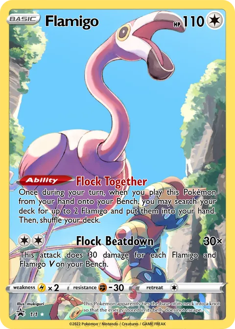 Once during your turn, when you play this Pokémon from your hand onto your Bench, you may search your deck for up to 2 Flamigo and put them into your hand. Then, shuffle your deck.