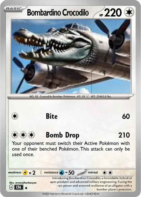 NO. 02 Crocodile Bomber Pokémon HT: 19' 1" WT: 25442.0 lbs.illus. armenjiharhanyanIntroducing Bombardino Crocodilo, a formidable hybrid of apex predator and advanced military engineering. Fusing the raw power and armored resilience of an alligator with a bomber plane's precision.Created by @CardMaster6 on 11 May 2025