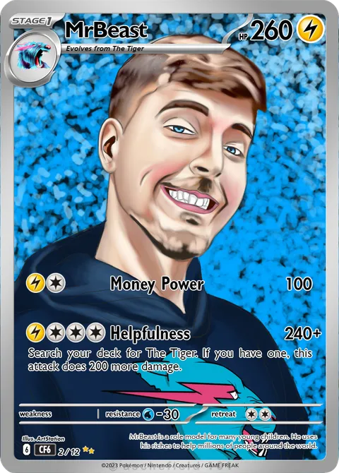 illus. ArtStation#2/12MrBeast is a role model for many young children. He uses his riches to help millions of people around the world.Created by @CardMaster6 on 20 April 2024