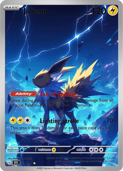 illus. PLANTEA tonkaski#53/911Jolteon is very water sensitive. If one drop touches it it will go on a rampage, destroying everything in it’s path.Created by @Carlos789 on 18 June 2025Includes assets by Creatures Inc.