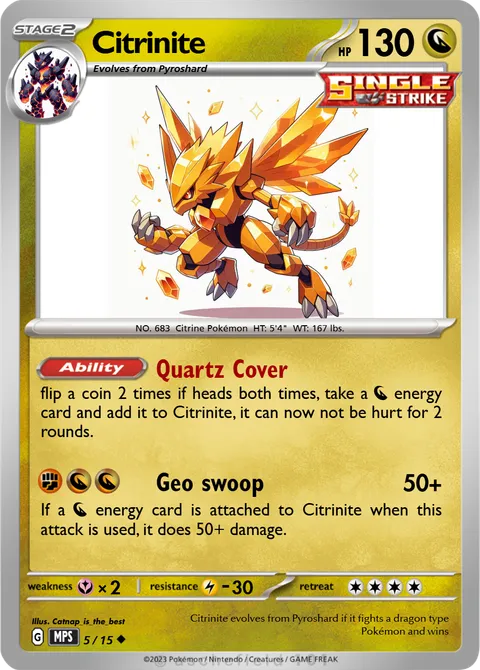 flip a coin 2 times if heads both times, take a N energy card and add it to Citrinite, it can now not be hurt for 2 rounds.
