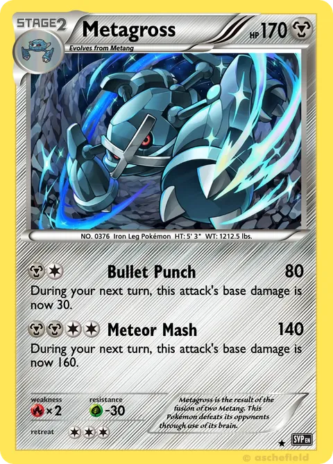 NO. 0376 Iron Leg Pokémon HT: 5' 3" WT: 1212.5 lbs.Metagross is the result of the fusion of two Metang. This Pokémon defeats its opponents through use of its brain.Created by @ChatGpT on 14 March 2026, last edited on 14 March 2026Includes assets by Creatures Inc.