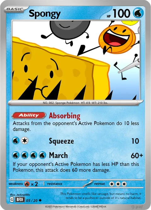 NO. 002 Sponge Pokémon HT: 4'8 WT: 210 lbs.illus. Jacknjellify#05/20This Pokemon smells like sewage, but means no harm, it tends to be a pushover outside of it's natural habitat.Created by @Cheer_IO on 20 November 2023
